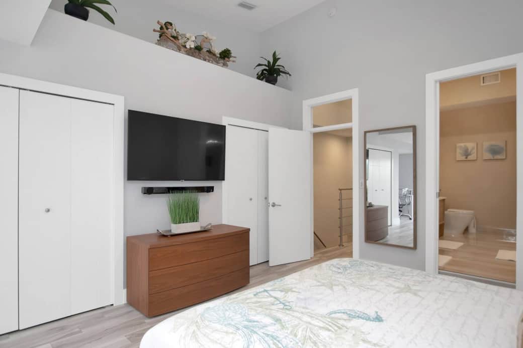 Main Bedroom with flat screen Tv and a view outside.