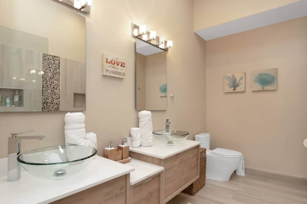 Luxurious main bath with double sinks and double shower.